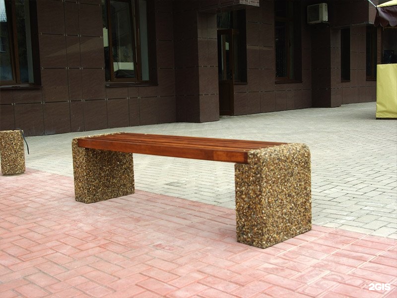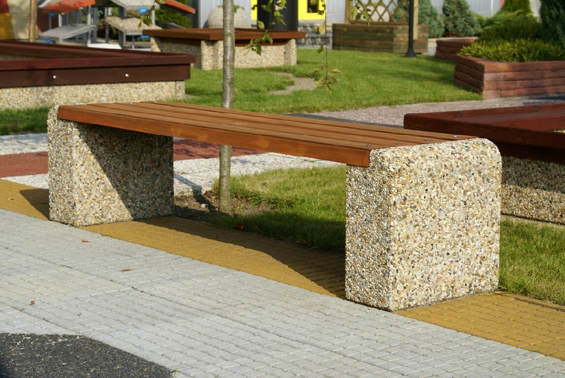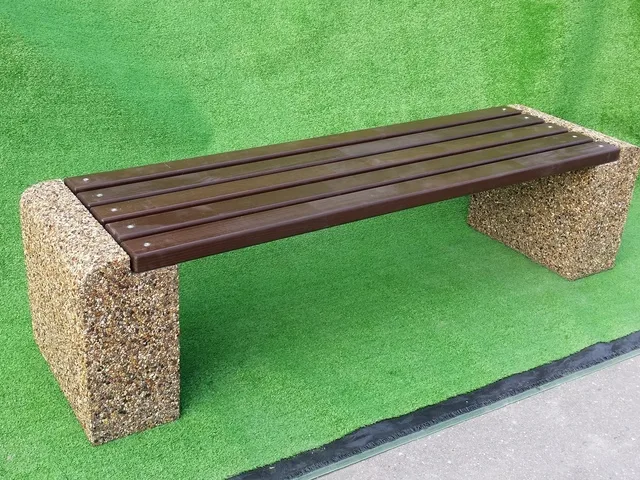 Основанием скамейки является две бетонно-монолитные конструкции с фактурой из натурального камня. Внешний фасад конструкций имеет фактуру: мрамор , гранит, галька фракция от 3мм до 15мм или бетон, крашенный или пигментированный бетон. Сиденье скамейки состоит деревянных брусков, покрытых защитным составом с UF фильтром.